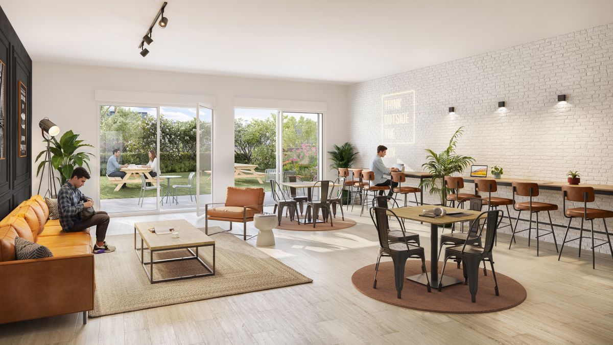 Les studios tous meublés et équipés, sont complétés par des espaces partagés : cuisine et salle commune, terrasse paysagée et laverie.