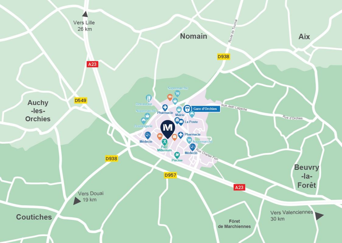 A ORCHIES, devenez propriétaire de votre appartement neuf du 2 au 4 pièces avec balcon ou terrasse, et parking !Entre ville et campagne, notre résidence se situe dans la petite commune recherchée d'Orchies au cœur d'un territoire champêtre typique. Véritable havre de paix, la résidence comprend 28 appartements, du 2 au 4 pièces, tous ouverts sur un espace extérieur : jardin privatif en rez-de-chaussée, balcon ou terrasse au dernier étage. Au quotidien, tout est à portée de main, il vous faudra seulement 2 min à pied pour emmener vos enfants à l'école maternelle ou primaire ou au Collège du Pévèle. A environ 500 m, se trouvent la Place de la Mairie et tous les services du quotidien. Contactez vite un de nos conseillers pour découvrir tous nos appartements neufs à Orchies et profitez de notre offre exclusive !