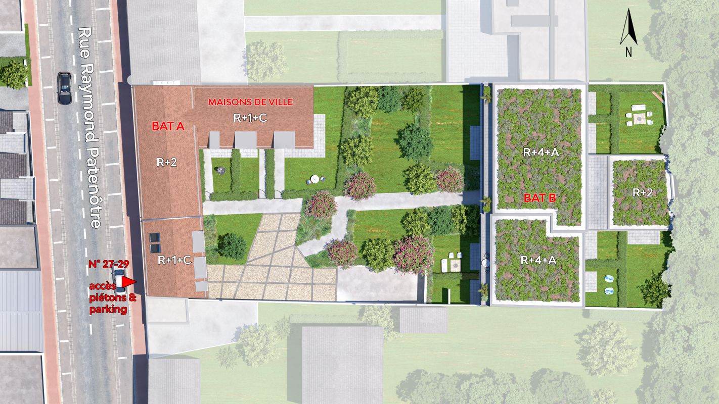 Situées dans le quartier résidentiel Patenôtre Petit Parc, « Les Bastides » se dévoilent tel un petit trésor bien caché où appartements et maisons se côtoient harmonieusement dans un écrin de verdure. La résidence se compose de deux petits bâtiments et trois maisons de ville au charme authentique et à l'architecture classique .Ainsi, côté rue, s'insère délicatement dans le paysage environnant, une élégante bâtisse arborant des petites tuiles plates en toiture et parement de pierre type meulière ou enduit clair en façade. Pour un surplus d'intimité, trois maisons de ville avec 3 chambres, terrasse et jardin privatif, séparées par des haies vives, se déploient le long du coeur de l'ilot paysager. Plus en retrait et dissimulé au beau milieu de ce havre végétal, le deuxième bâtiment révèle des appartements au calme, déclinés du studio au 4 pièces familial dont la plupart bénéficient d'un jardin privé en rez-de-chaussée, de loggia aux étages supérieurs ou d'une belle terrasse en attique.