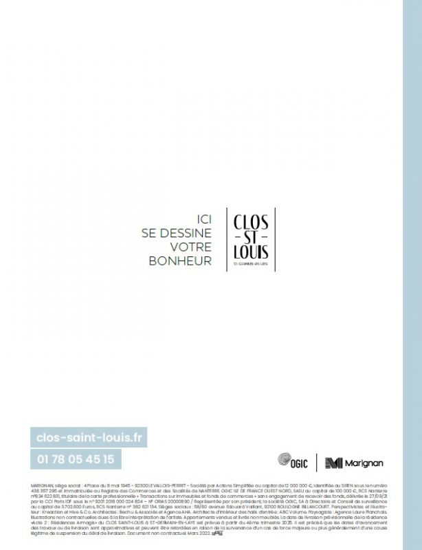 Les 30 jours Flash ! Faites la meilleure affaire de fin d’année à Saint-Germain-en-Laye et emménagez immédiatement ! Jusqu’à 20 000 euros de remise et frais de notaire offerts. C'est dans la ville très cossue de Saint-Germain-en-Laye que Marignan, en association avec OGIC, dévoilent leur nouvelle réalisation, dans le cadre unique du nouveau quartier "Clos Saint-Louis", créé dans le prolongement du centre-ville, autour de l’ancien hôpital réhabilité. Découvrez les appartements de grand standing de la résidence "Acte II Résidences Armagis", pensés pour offrir des volumes généreux baignés de lumière. Soyez parmi les privilégiés à choisir votre futur bien immobilier, du studio au 5 pièces, à 850 m du RER A.Il fera bon vivre et se promener en toute sécurité dans ce vaste quartier, entièrement piéton et végétalisé, et profiter de l'animation des commerces, restaurants et nombreuses boutiques.Contactez-vite un de nos conseillers pour découvrir tous nos appartements neufs à Saint-Germain-en-Laye !